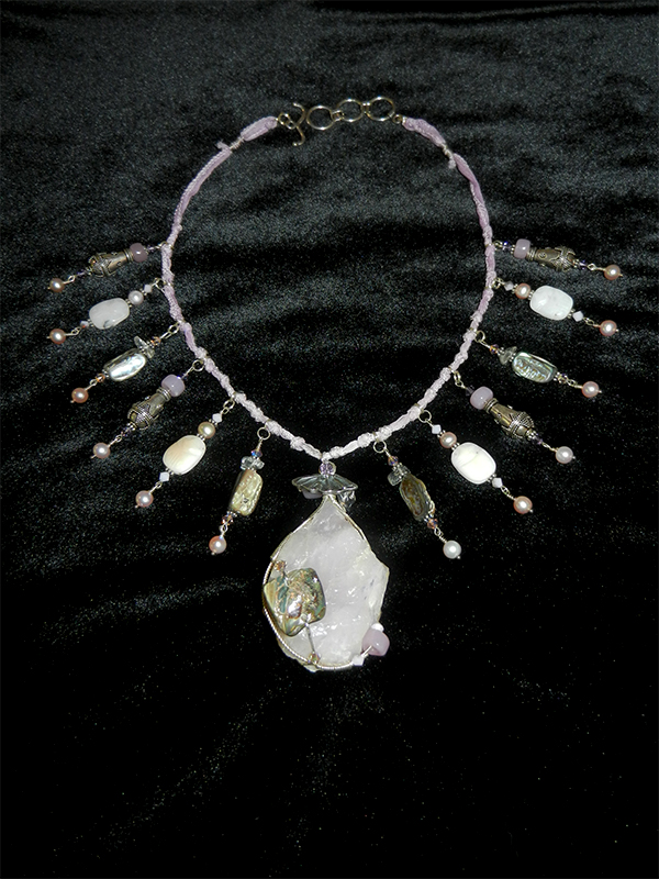 orchid quartz, pink opal, vintage glass, abalone, pearl, crystals, Silver Art Clay, sterling and Bali silver, pink silk ribbon