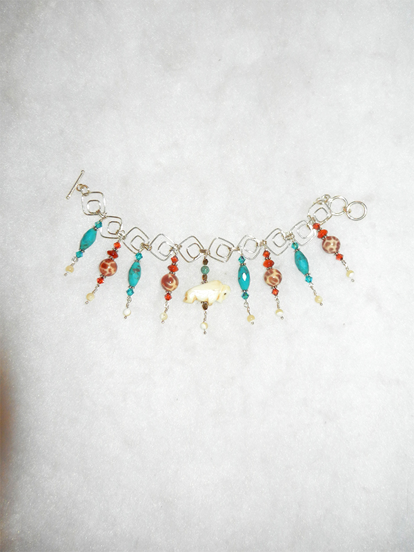 Montana Wrist Halo Components: turquoise, fire agate, bone,carnelian, mother-of-pearl, crystals, sterling and Bali silver $75.00 length: 6 1/2'' - 7'' · centerpiece: 1 1/2'' L x 1'' W total weight: 70 oz.